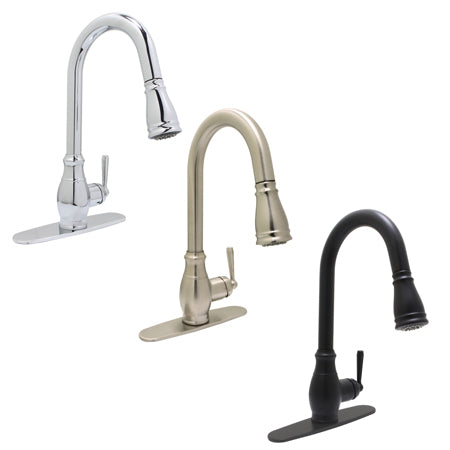 ReliaFlo kitchen faucets come in three elegant finishes: Chrome, Satin Nickel, and Matte Black. Chrome offers a high-shine, modern look that brightens spaces. Satin Nickel has a warm, brushed texture that complements various decors. Matte Black provides a bold, contemporary aesthetic. All finishes are durable and designed for reliable performance, adding style and functionality to any kitchen.