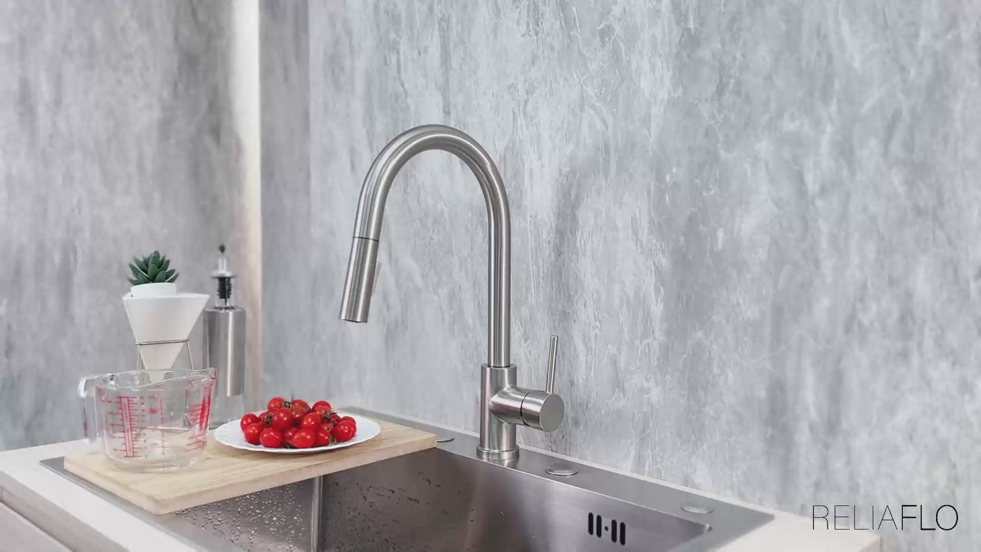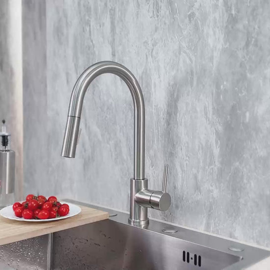 This pull-down kitchen faucet showcases sleek and contemporary design, highlighted by its high-arc spout and meticulous details that blend functionality with timeless appeal. Featuring a dual-function pull-down spray head, this faucet serves as a standout centerpiece for any kitchen.